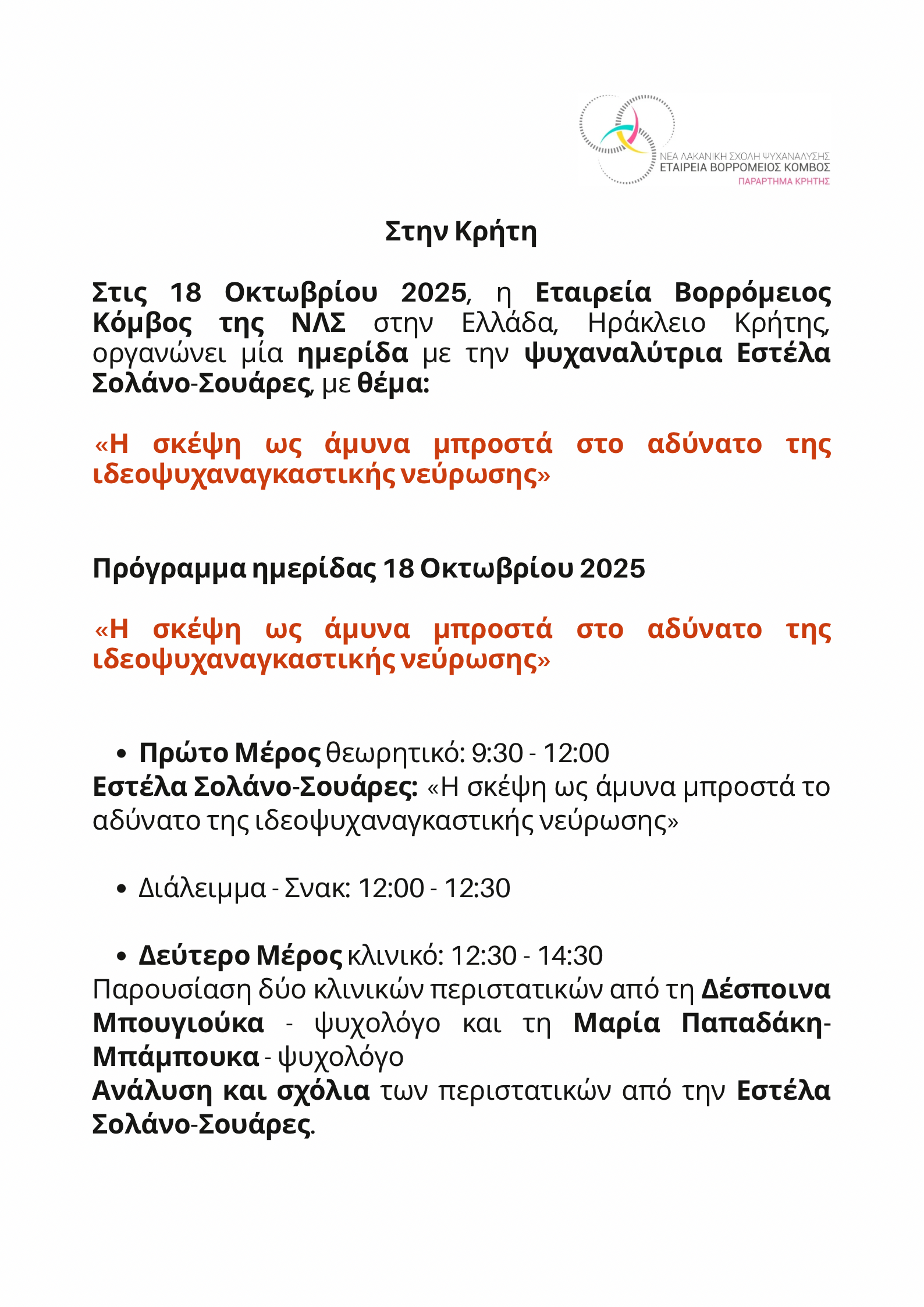 ΗΜΕΡΙΔΑ ΚΡΗΤΗΣ 18.10.2025 ΗΜΕΡΟΜΗΝΙΑ: Σάββατο, 18 Οκτωβρίου 2025 ΏΡΑ: 9:30 ΤΟΠΟΘΕΣΙΑ: ΓΕΩΡΓΙΟΥ ΠΑΠΑΝΔΡΕΟΥ 84 ΗΡΑΚΛΕΙΟ ΚΡΗΤΗΣ Ομιλητής: ΕΣΤΕΛΑ ΣΟΛΑΝΟ-ΣΟΥΑΡΕΣ Συζήτηση με: ΔΕΣΠΟΙΝΑ ΜΠΟΥΓΙΟΥΚΑ, ΜΑΡΙΑ ΠΑΠΑΔΑΚΗ-ΜΠΑΜΠΟΥΚΑ Προεδρείο: ΓΕΩΡΓΙΑ ΦΟΥΝΤΟΥΛΑΚΗ Προηγούμενο άρθρο: ΕΚΠΑΙΔΕΥΤΙΚΟ ΠΡΟΓΡΑΜΜΑ ΚΡΗΤΗΣ 2025-2026 Προηγούμενο Επόμενο άρθρο: ΤΟ ΟΙΚΟΓΕΝΕΙΑΚΟ ΜΥΘΙΣΤΟΡΗΜΑ- ΤΟ ΔΡΑΜΑ ΤΟΥ ΥΠΟΚΕΙΜΕΝΟΥ Επόμενο
